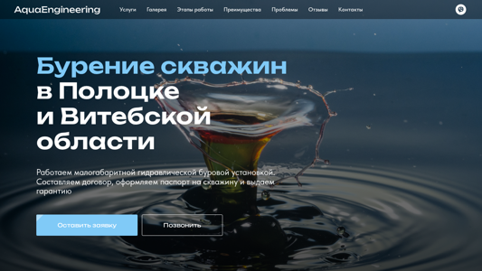 | AI-анализ | This website offers drilling services in the regions of Polotsk, Novopolotsk, and Vitebsk in Belarus. The company, AquaEngineering, provides services for the arrangement, repair, conservation, and de-conservation of wells, as well as the installation and mounting of septic tanks. The website mentions drilling for geothermal heating as an option. The company also creates contracts, documents, and offers a guarantee. The contact number is provided. The website includes a gallery of works, a description of the stages of work, advantages, problems, and reviews. AquaEngineering offers services using a small-scale hydraulic drilling rig. They also work in difficult-to-reach locations and have been in business for over 14 years. They can drill up to 100 meters deep and use NPVH (plastic) p |