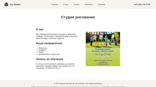 | AI-анализ | This online resource represents Izo Studio, an alternative art studio located in Жодино. The website offers online registration for drawing courses for children and adults. The studio specializes in various artistic techniques including painting, graphic arts, aquarelle, guash, pastels, charcoal, and pencils. The website provides information on classes, schedules, teachers, portfolios, and exhibitions. The studio aims to provide individualized attention and group sessions without bureaucracy or formalism. The website is a non-selling informational platform, and artistic activities are carried out in accordance with the Presidential Decree of Belarus №364 from October 9, 2017. |