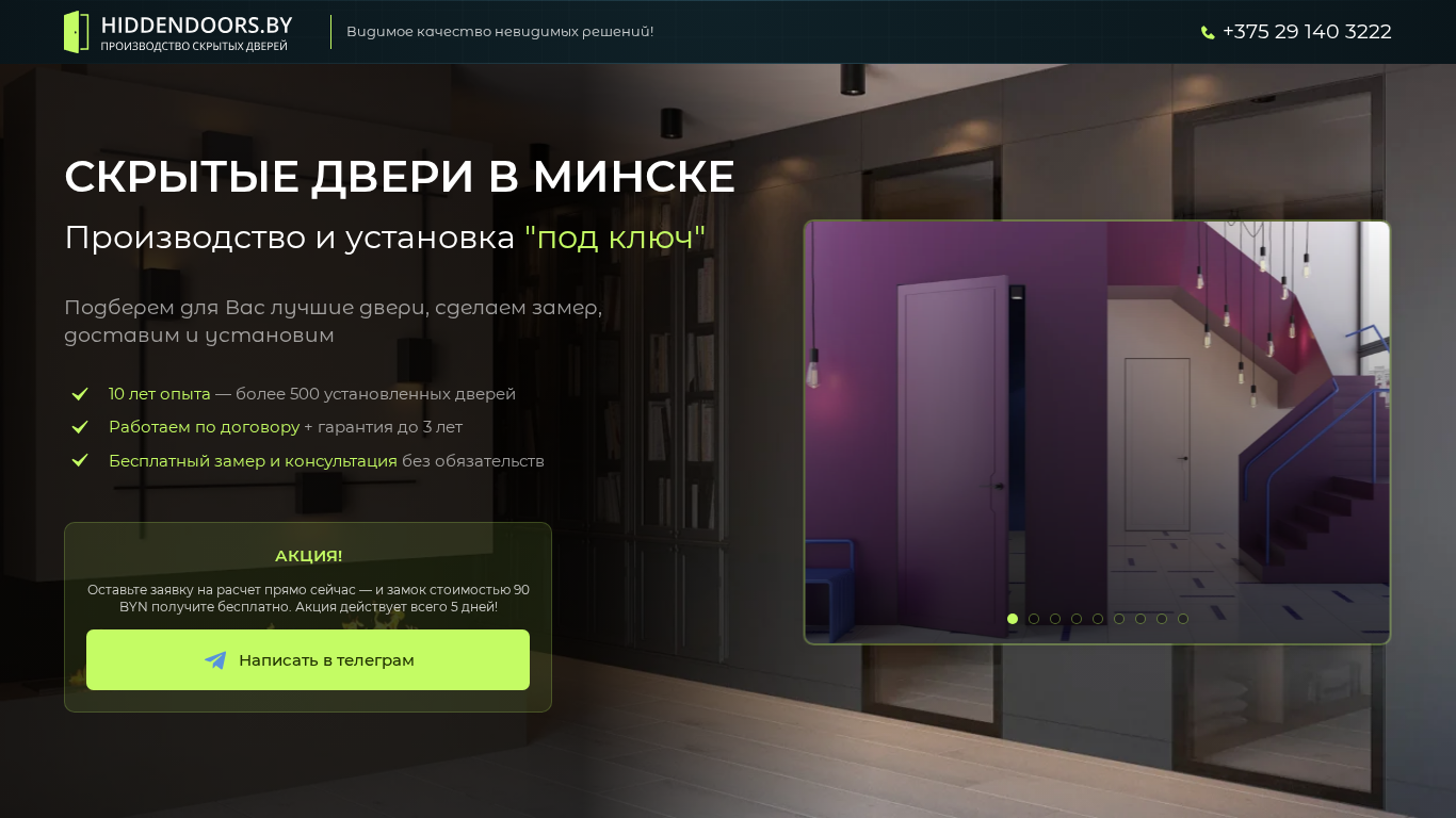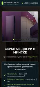 | AI-анализ | The web project "Hidden Doors in Minsk – Production and Installation of Hidden Doors under Key" offers Italian furniture, production and installation of hidden doors under key. They will select the best doors, make a measurement, deliver and install, with 10 years of experience and more than 500 installed doors. They work under contract with a 3-year guarantee. They provide free measurement and consultation without obligation. An offer includes an ongoing action: write in Telegram to leave a request for a quote and receive a lock worth 90 BYN for free. The action lasts for 5 days. The installation site can be a flat, private house, office or commercial space, or still undecided. The renovation stage can be still in planning, at the rough stage, at the clean stage, or after completion, and a new door is needed. The preferred method of door finishing is under painting |