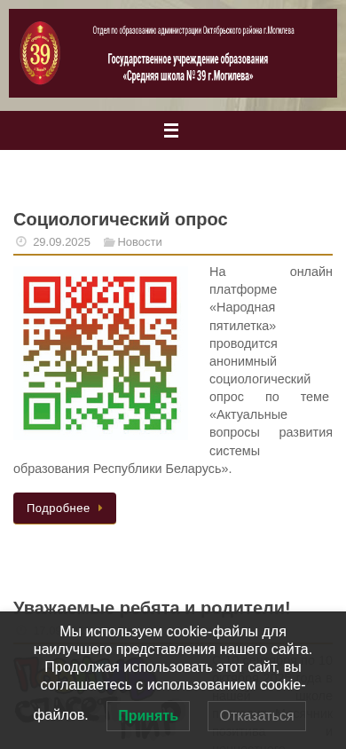 | AI-анализ | The website is a government educational institution, "Middle School #39 of the city of Mogilev" (ГУО "Средняя школа № 39 г.Могилева"). It provides information about the school's leadership, work schedule, structure, mission, goals, and accreditation. The school has a certificate of state accreditation and holds a special license for educational activities. The website features information on the educational model, green schools network in Belarus, employee roster, library, events, health school concept, school newspaper, and various educational and extracurricular activities. Users can find information on class schedules, after-school clubs, methodological resources, and school policies. The website also offers resources for young teachers, including attestation of pedagogical workers and a "one window" service for obtaining necessary documents. The school's history, achievements |
