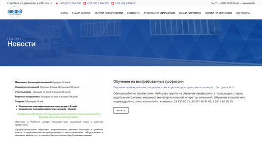 | AI-анализ | The website "Овидий.BY" is a news and educational platform focusing on various professional trainings. It offers courses for a range of short-term, vocational specializations including but not limited to: stonemason, gatekeeper, driver, boiler operator, and metalworker. The website also provides information on the benefits of the courses and their respective schedules, with options for both group and individual learning, as well as on-site and online instruction. The platform also features a contact page with multiple phone numbers for inquiries. The news section of the site includes recent announcements and articles related to healthy living. Keywords associated with the site include 'education', 'training', 'professions', and 'vocational'. |