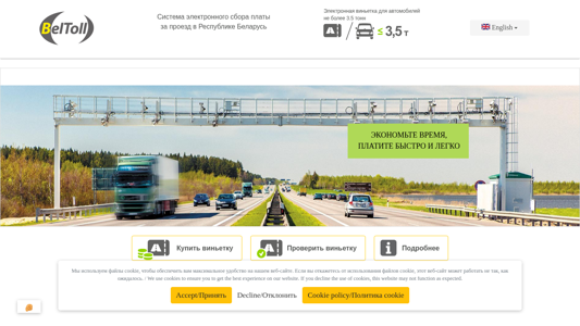 | AI-анализ | The website "Е-виньетка | BELTOLL" is an electronic toll collection system for vehicles up to 3.5 tons in the Republic of Belarus. The website offers an electronic toll pass for faster and easier payment of tolls. Users can buy a toll pass, check its validity, and find contact information for customer support. The website is owned by the BelToll system, which is managed by the State Road Administration of Belarus. Cookies are used on the website for optimal user experience. |