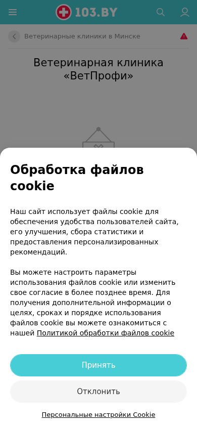 | AI-анализ | This website is a veterinary clinic named ВетПрофи located in Minsk, Belarus, at the address Мельникайте 8А. The website provides information about the clinic's phone numbers, working hours, and customer reviews. Users can also find a map for directions to the clinic on the medical portal 103.by. The website includes a menu, a search function, and an option to report errors. It also features a section for veterinary clinics in Minsk, a contact form, and a page for project information. The website is operated by OOO «Артокс Лаб» and includes links to their public contract, user agreement, and information on vacancies and partnerships. The website uses cookies for user convenience, site improvement, statistics collection, and personalized recommendations, and users can adjust cookie settings accordingly. The website is part of the 103.by |