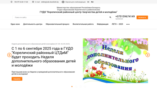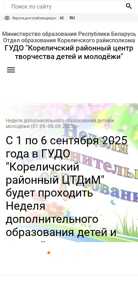 | AI-анализ | This website is the official page of the "Korelichsky District Centre for Children and Youth Creativity" in Belarus. It welcomes visitors with a warm greeting and informs them about the unique atmosphere of creative exploration and comfortable conditions for a full, interesting, and active life for students. The dedicated team of educators, fully committed to the children, builds their work around creating a special environment for artistic development and personal growth. The website provides information on the institution's structure, work schedule, administrative procedures, contacts, and policies regarding personal data protection. Additionally, it features news and announcements, educational programs, and initiatives related to various events and projects. The domain name is "ctdim.edu-korelichi.by". |