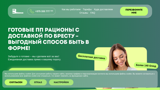 | AI-анализ | --- The website ppbalance.by is a food delivery service based in Brest, Belarus. It offers daily delivery of prepared healthy meals with over 140 options, convenient pricing, and free delivery. The company's mission is to help people eat well and correctly every day. Users can select a suitable tariff, and the meals will be prepared and delivered to their doorstep. The website provides information on how it operates, its tariffs, delivery areas, customer reviews, and a FAQ section. It also notifies users that it uses cookie files for site improvement and analysis. The site offers various meal plans tailored to different dietary needs and goals, such as weight loss, maintaining balance, or gaining weight. The pricing ranges from 33 Belarusian Rubles for one day to 560 Belarusian Rubles for two weeks. Users can place orders for different calorie intakes |