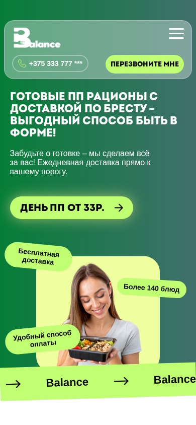| SEO-описание | Ежедневная доставка готового правильного питания по Бресту и окрестностям. Более 140 полезных блюд, удобные тарифы, бесплатная доставка. Питайтесь вкусно и правильно каждый день с ПП Баланс! |