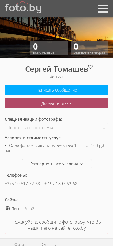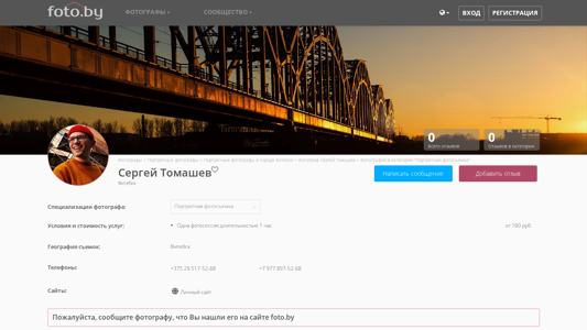 | AI-анализ | --- This online resource is the personal website of photographer Sergei Tomashev based in Vitsebsk, Belarus. The site primarily features a catalog of his portrait photography work. The photographer specializes in portrait photography and offers his services in the cities of Vitsebsk, Minsk, Mogilev, Grodno, and Homel. |