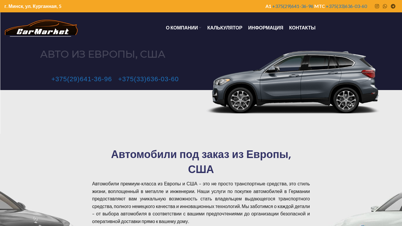| AI-анализ | The web project "Carmarket.by" is an auto import business from Europe and Russia, operating in Minsk, Belarus. They offer to bring cars directly from Europe and Russia without involving intermediaries, providing quality and guarantee, along with delivery and customs clearance services. The company specializes in importing vehicles from Germany, the USA, and other countries, providing a wide range of premium-class cars full of German quality and innovative technologies. Through their services, clients have the opportunity to become owners of exceptional transportation means. The website offers information on various brands, such as "Autos from Europe," "Autos from the USA," and "Autos from Germany," among others. Clients can also find details about the purchase process, including a calculator, and contact information. The company aims to provide a unique buying experience by offering quality, convenience, and competitive pricing. The website is available at carmarket |