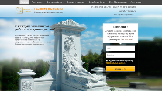 | AI-анализ | The website is a memorial workshop offering various services related to the creation, delivery, and installation of memorials, including plaques and medallions, as well as the restoration of portraits and engraving of epitaphs on graves. The main menu of the site includes sections on classic and figurative memorial designs, artistic rezing, memorial crosses, premium class memorials, a photo gallery, landscaping, and various other services related to grave decoration and masonry. The site also features a catalog of images for monument designs, including angels, flowers, and candles, as well as suggested fonts for monument engraving. Additionally, the site offers items such as vases, lamps, sculptures, and crosses, as well as services for memorial restoration and engraving on natural stone. The site provides contact information for inquiries and offers a free 2D design |