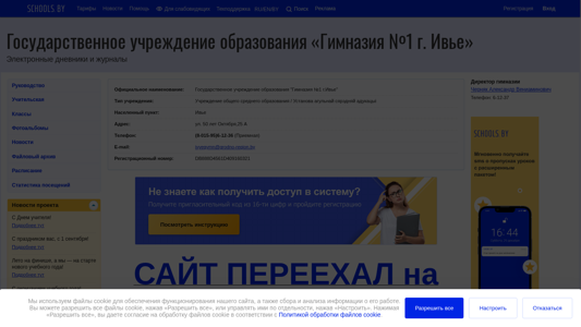 | AI-анализ | This website is the official website of State Educational Institution "Gymnasium No. 1 in Ivye" in Belarus. The website uses cookies for site functionality and data collection and analysis. Users can allow all cookies or manage them individually through the site's cookie settings. The site contains information about the educational institution, news, and instructions for students and parents. The design is simple with a monochrome color scheme and images disabled. The website's title is "Государственное учреждение образования «Гимназия №1 г. Ивье»" and it is located at gymn1ivye.schools.by. |