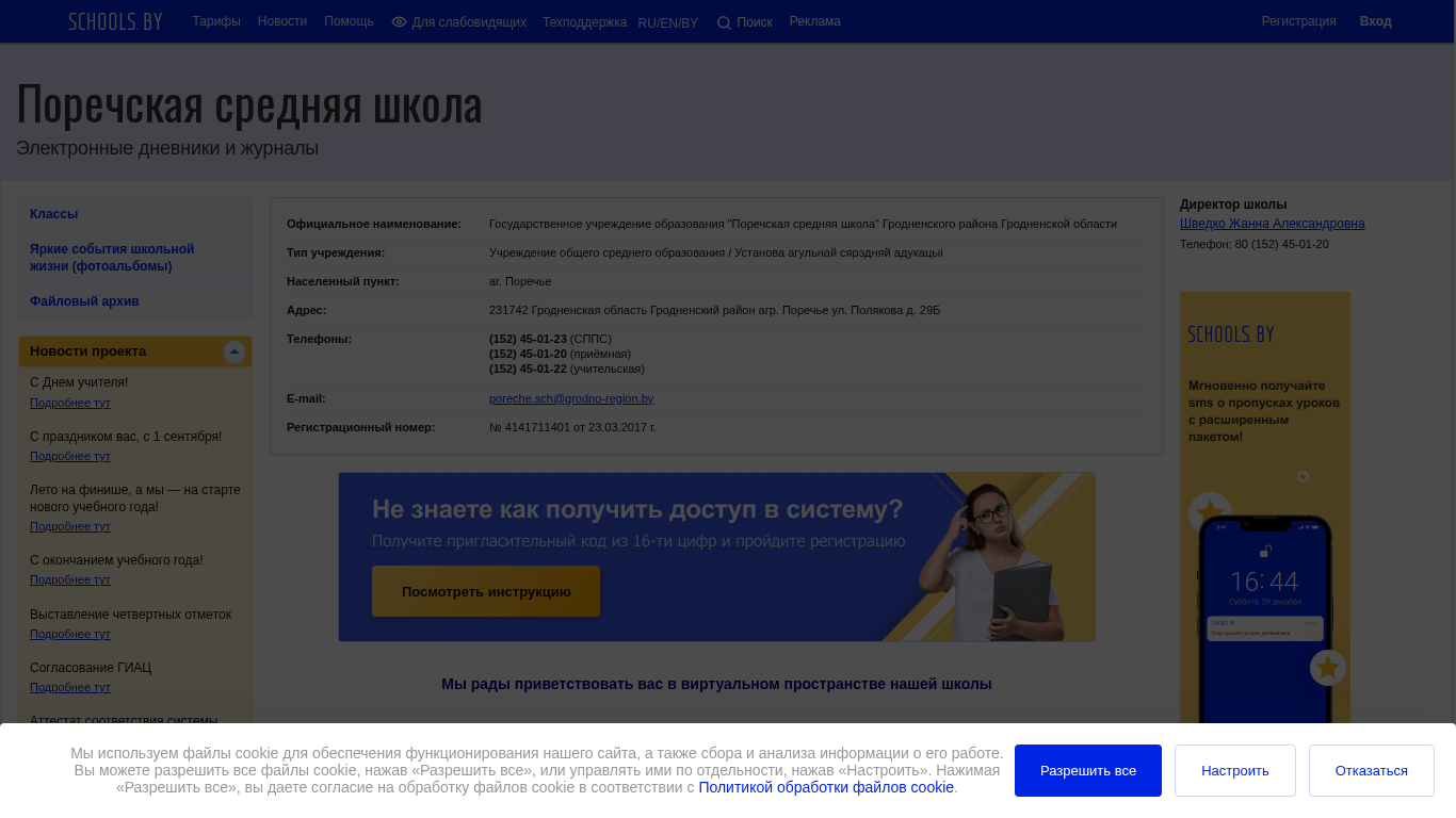 | AI-анализ | This online resource is the official website for Поречская средняя школа (Porechskaya Srednyaya Shkola), a secondary school located in Belarus. The website uses cookies for site functionality and data collection and analysis. Visitors can either allow all cookies or manage them individually, with the option to read the site's cookie policy and view a list of cookies with their descriptions and retention periods. The domain is part of the Schools.by network. |