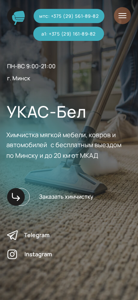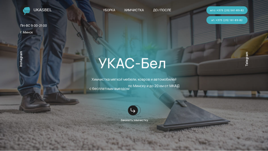 | AI-анализ | This website is a cleaning and upholstery service based in Minsk, Belarus, offering furniture, rug, and car cleaning services. The title of the website is "Ukas Bel" and the description includes keywords related to cleaning and pricing, such as "chemical cleaning of sofas and other furniture," "carpet cleaning," "car washing," and "affordable prices." The most frequently used words on the website are "при" (which translates to "before" or "at,") "химчистка" (which means "chemical cleaning" or "upholstery cleaning"), "мебели" (meaning "furniture"), "загрязнений" (which translates to "stains" or "soil"), and "цены" (meaning "prices"). The website provides phone numbers for contact and offers home and office |