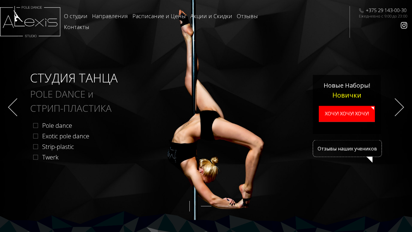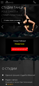 | AI-анализ | The web project "Alexis | Студия танца на пилоне" is a pole dance and strip-plastic studio located near the metro station in Minsk, Belarus. The studio offers experienced trainers and a range of dance styles including pole dance, exotic pole dance, and strip-plastic. The studio has six professional poles for static and dynamic movements, a mirror on the entire wall, a comfortable changing room, high-quality sound system, and all necessary equipment for lessons. The studio prides itself on being one of the best in Minsk and offers a spacious, comfortable room with a new air conditioner. The studio offers a wide range of dance styles and caters to all levels, including beginners. It has a special program for newcomers and those with no prior experience in dance or sports. The studio prioritizes health and safety and has classes that include not |