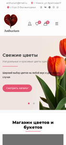 | AI-анализ | --- This website is a flower shop named Anthurium.by based in Minsk, Belarus. The online store offers a wide selection of roses, bouquets, compositions, and custom solutions to help customers choose the perfect arrangement for any occasion. Keywords associated with the site include 'byn', 'cart', 'hit', 'bouquet', 'flowers', 'rose', and 'store'. The top words are 'cart', 'byn', and 'hit', indicating a focus on sales and popular items. The website also includes sections for news, contacts, and information about the company and payment methods. The homepage displays various flower arrangements, prices, and options for customers to add items to their cart. The top-selling items include a bouquet of roses called 'Dinara', a custom rose called 'Jizel', and a bouquet with a lily. The website is |