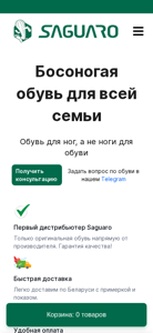 | SEO-описание | Босоногая обувь Saguaro создана для тех, кто ценит свободу движения. Современные материалы, zero drop-подошва, поддержка стопы, большие размеры. Размерный ряд от 24 до 48. Доставка по Минску и Беларуси. Шоурум для примерки! |