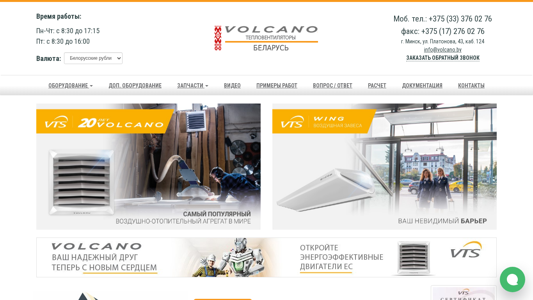| AI-анализ | --- The website is an official distributor of Volcano heating ventilators in Belarus, named ООО "ВентГут". The site offers various Volcano products, including air curtains WING, WING PRO, Defender, Volcano VR NEW, and Volcano VR Mini AC, with their specifications such as power, production capacity, and weight. Additionally, the website provides information on accessories, spare parts, and documentation. The contact details include working hours, currency, and location in Minsk. The site claims to be the market leader in Belarus, with fast and reliable delivery, and all products are tested before shipment. The site is available in Belarusian and Russian languages. |