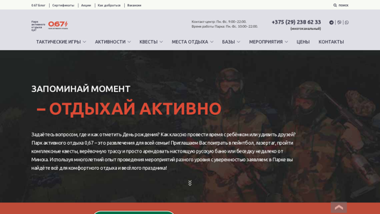 | AI-анализ | The web project "Park of Active Recreation 0.67 – ✔Paintball, ✔Laser Tag, ✔Quests" is a recreation park offering various activities for groups. It features paintball, laser tag, and quests. The park is located in Belarus and can be reached by phone at +375 (29) 238-62-33. The menu, blog, certificates, and offers can be found on the website. The park provides tactical games such as paintball, kidball, laser tag, archery tag, hydroball, strikeball, and activities like tyre, swing, and a complex of services. Wooden English games, bumperball, animators, and catering services are also available. Quests include Fort Boyard, Fort Boyard 2.0, Master Teney, Indiens vs Cowboys, |