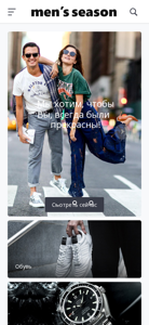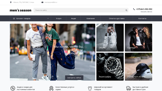 | AI-анализ | This website is an online catalog for men's and women's clothing, shoes, accessories, and services. The title is "Men's season" and the keywords include "одежда" (clothing), "обувь" (shoes), "услуги" (services), and related terms. The top words indicate that categories consist of men's and women's clothing, shoes, and accessories, as well as services and company information. The website is located in Minsk, Belarus, at EXPOBEL mall on the 2nd floor, and can be reached via phone or email for inquiries. The catalog includes a variety of clothing items such as coats, costumes, shirts, jeans, sports clothes, and shoes including sneakers, sandals, and moccasins. Accessories like baseball caps, bags, watches, and eyewear are also |