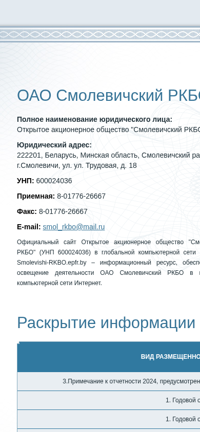 | AI-анализ | This website is the official informational resource for Open Joint Stock Company "Smolevichi RKBO" (UNP 600024036), located in Smolevichi, Belarus. The site provides access to various documents, including annual reports and auditor's reports, for the years 2018 to 2025. Users can download these files in PDF format. The website also includes a section for registering and accessing a personal cabinet, which requires an email address and password. Some documents, such as the annual reports, are password-protected and can only be accessed with the provided credentials. Other information on the site includes the company's name, address, and contact details. The site is developed by epfr.by. |