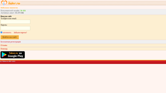 | SEO-описание | Tabor.ru - популярный сайт знакомств. Уже более 18 лет успешно знакомим людей бесплатно и максимально эффективно! |