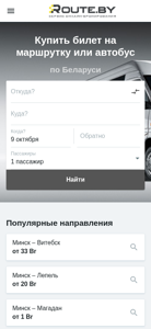 | AI-анализ | The web project Route.by is a website where users can buy or reserve bus tickets for marshrutkas (shared minibuses) and buses throughout Belarus. The website title is "Route.by | Удобная покупка билетов на маршрутки и автобусы по всей Беларуси" (English: Route.by | Convenient purchase of bus tickets for marshrutkas and buses throughout Belarus). The description states, "Купить или забронировать билеты на маршрутку📱 В приложении быстрее и еще удобнее!" (English: Buy or reserve bus tickets for marshrutkas in the app, even quicker and more convenient!). The website's top keywords include "витебск" (Vitebsk |