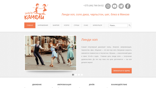 | SEO-описание | Студия танцев «Качели». Линди хоп, блюз, буги-вуги, соло джаз, шэг, чарльстон, бальбоа. Единственная студия танцев в Минске, специализирующаяся только на свинговых танцах. |