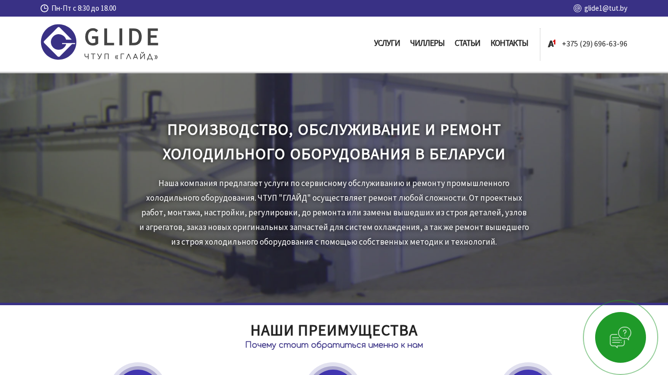 | SEO-описание | ЧТУП «ГЛАЙД» - производство, обслуживание и ремонт холодильного оборудования в Республике Беларусь. Большой опыт работы, гарантия качества. |