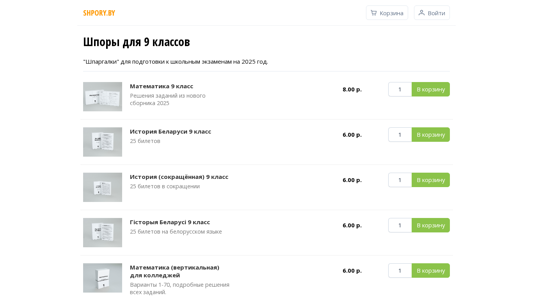 | AI-анализ | This online resource, titled 'Shpory.BY', is an e-commerce platform offering study guides, or 'шпоры', for the 9th grade students in Belarus. The website provides collections of study sheets with all possible test variants for mathematics and history subjects, along with solutions. The mathematics section includes both vertical and horizontal layouts for college students. The website mentions the option for customers to write to the email address admin@shpori.by for any inquiries. The title suggests that these study guides are specifically designed for the 2025 exams. The prices range from 4.08 R to 8.00 R, with some items offering free shipping when purchasing ten or more. The website is operated by IB Boyko MA, with the UNP number 791053116. |