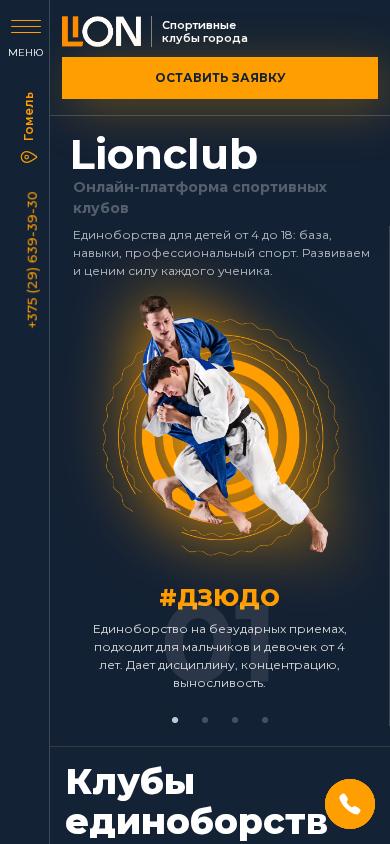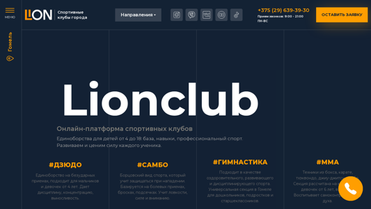 | SEO-описание | Детские клубы единоборств Lion в Гомеле. Школа самбо, дзюдо, ММА, карате, тхэквондо, бокс, вольная и греко-римская борьба. Тренировки для детей от 4 до 18 лет: профессиональный спорт, аттестации на КМС и МС или любительские занятия для общего развития. 6 залов секций во всех районах Гомеля 2-4 раза в неделю. Оплата взносами. |