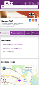 | AI-анализ | This website is a business-to-business platform for buying farm produce, specifically grains such as wheat, barley, triticale, oats, rye, grain mix, and corn, in Belarus. The company, Biolia OOO, is located in Minsk at the address Тимирязева, 67, 220035. The website includes contact information with a phone number +375 (33) 645 05 xx and an organization registration number UNP: 193526907. The business hours are from 09:00 to 18:00, Monday to Saturday, with no lunch break. The company is listed under the agriculture category in the Yellow Pages of Belarus. |