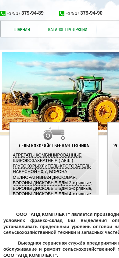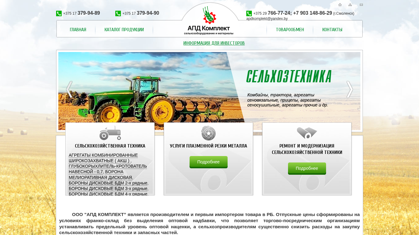 | AI-анализ | --- The web project "APD Komplekt" is an agricultural equipment trading platform with a comprehensive catalog of products. Keywords associated with the site include "бороны" (plows), "дисковые" (disc plows), "бдм" (BDM plows), "рядные" (row plows), "подробнее" (details), "сельскохозяйственной" (agricultural), "техники" (technology), "ооо" (LLC), "апд" (APD), "комплект" (set), and "ремонт" (repair). The site offers a range of agricultural equipment, including combine harvesters, tillage equipment, and plows, in various sizes and configurations. The business is a producer and the first importer of these products in Belarus, enabling competitive pricing and easy |