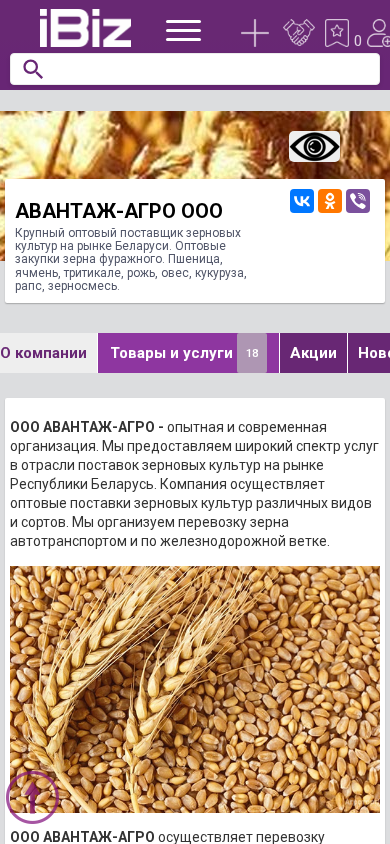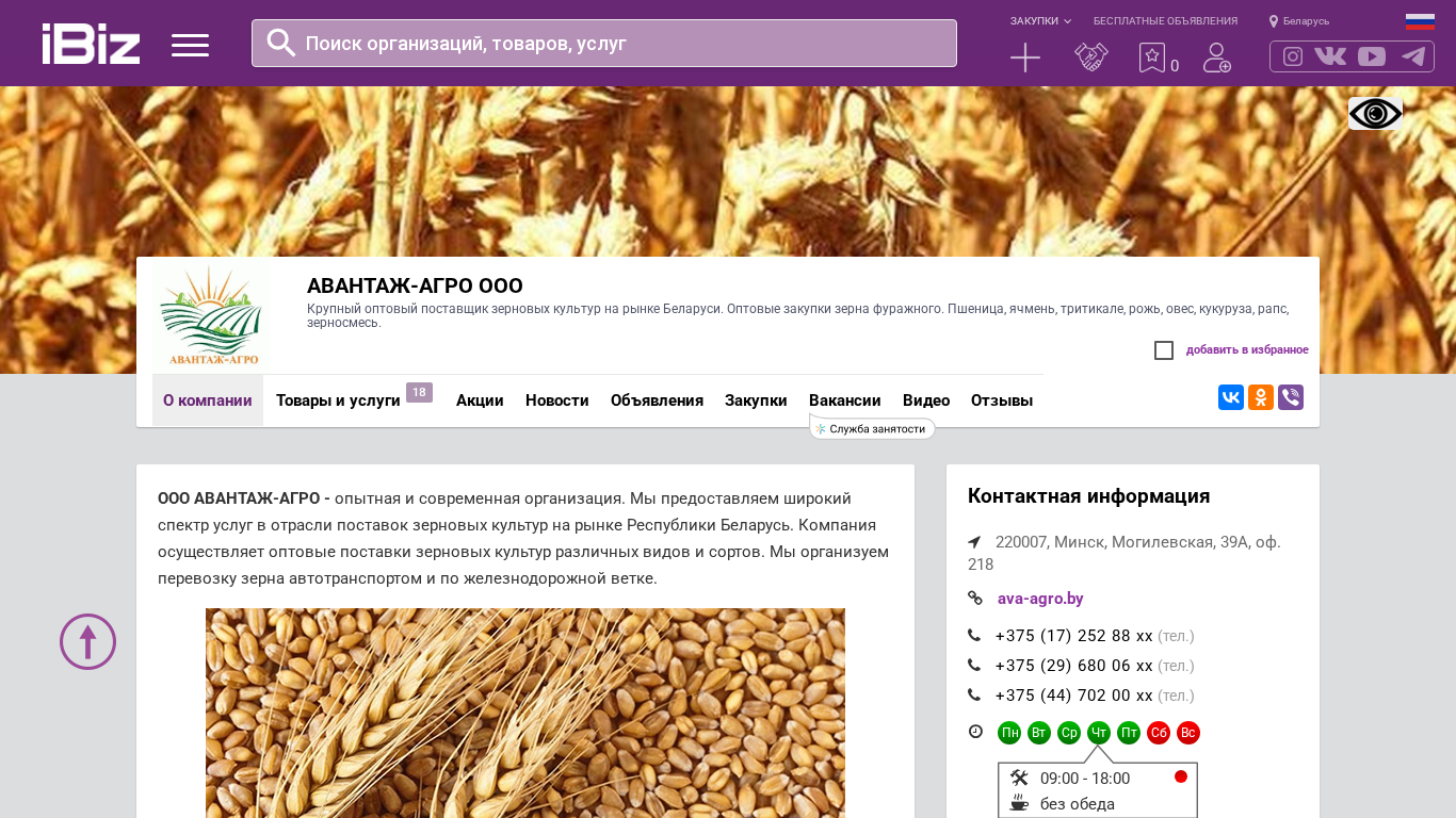 | Название / Заголовок | АВАНТАЖ-АГРО ООО - Крупный оптовый поставщик зерновых культур на рынке Беларуси. Оптовые закупки зерна фуражного. Пшеница, ячмень, тритикале, рожь, овес, кукуруза, рапс, зерносмесь.. 220007, Минск, , Могилевская, 39А, оф. 218 |