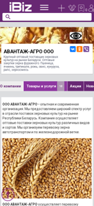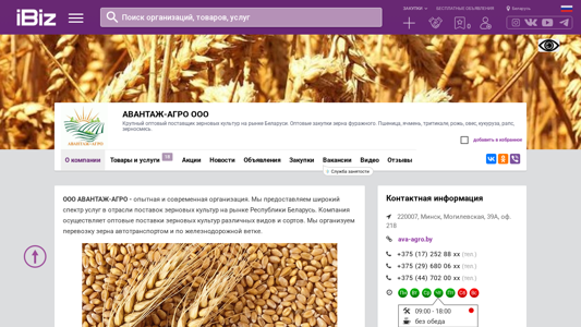 | AI-анализ | The web project "Avantha-Agro OOO" is a large wholesale supplier of grain crops in the Belarusian market. They specialize in bulk purchases of feed grain. The offered grains include wheat, barley, triticale, rye, oats, corn, rapeseed, and grain mixtures. The company is located in Minsk, Belarus, at Molievskaya Street 39A, office 218. Contact numbers for the company are +375 (17) 252 88 xx, +375 (29) 680 06 xx, and +375 (44) 702 00 xx. The business hours are from 9:00 AM to 6:00 PM, Monday through Friday, with no lunch break. Av |
