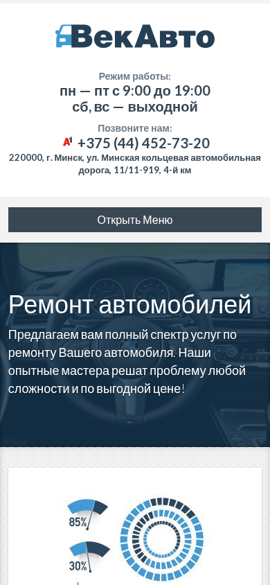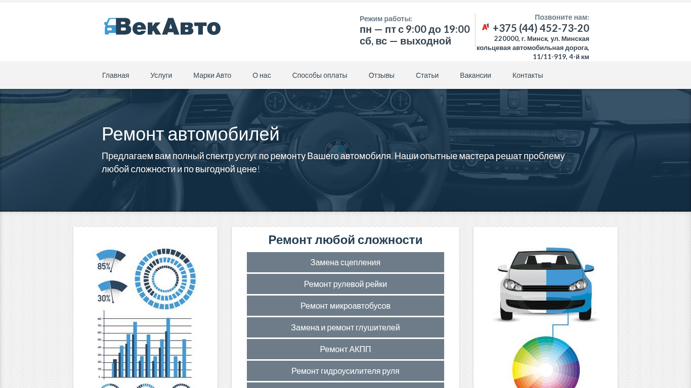 | AI-анализ | This online resource, titled "Век-Авто - Ремонт автомобилей по низкой цене" (Vek-Auto - Car Repair at Low Prices), offers a comprehensive range of repair services for various types of automobiles. The keywords "ремонт" (repair), "замена" (replacement), and "век-авто" (Vek-Auto) are frequently used. The website provides repair services for engines, transmission, suspension, steering, brakes, and exhaust systems. The business is located in Minsk, Belarus, on Minskaya Kolcevaya Avtomobilnaya Doroga (Minsk Ring Road), 11/11-919, 4th km. The contact number is +375 (44) 452-73-20 |