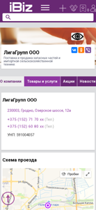 | AI-анализ | language: ru This website is for ЛигаГрупп ООО, a company located in Grodno, Belarus, at Озерское шоссе, 12a. The website provides information about the company's offerings of spare parts and imported agricultural machinery for sale. The contact information, including phone numbers, is displayed on the website. The company's UNP number is 591004057. The website also includes a map for directions and business hours from 9:00 AM to 6:00 PM, Monday through Friday, with Saturdays and Sundays being closed. The website falls under the categories of 'Parts for agricultural machinery' and 'Agricultural machinery' in the Yandex Business Directory. |