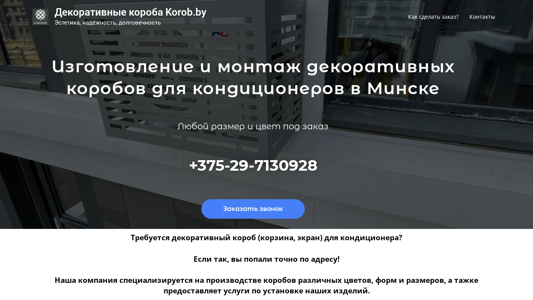 | AI-анализ | The website Korob.by offers decorative boxes for air conditioners. The company specializes in the production, delivery, and installation of various-sized and colored decorative boxes for air conditioners in Minsk. Customers can order customized boxes with specific perforations. The website highlights the benefits of their decorative boxes, such as their ease of installation, and the fact that the cover can be removed for servicing the air conditioner without the need for full disassembly. The website also provides contacts for customers to place orders and inquire about prices. |
