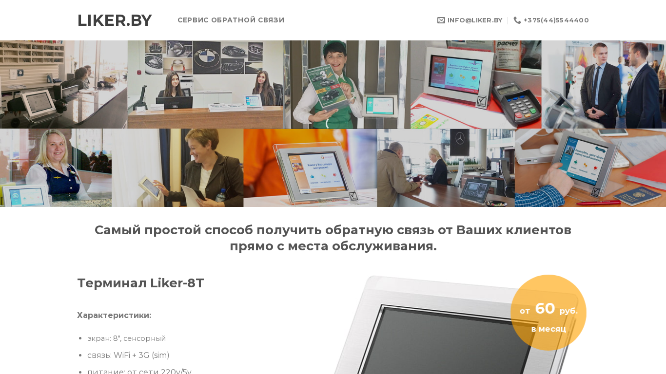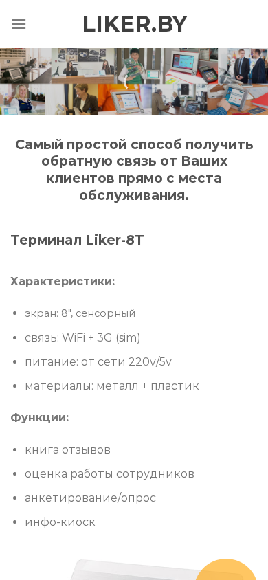 | AI-анализ | The portal Liker.BY is a customer feedback service providing equipment and software for client communication. It offers features such as quality assessment, electronic book of reviews, and employee rating. The portal operates with a terminal called Liker-8T, featuring an 8-inch screen, WiFi and 3G connectivity, and a minimum monthly rental fee of 80 Belarusian rubles. The initial three-month rental comes with a 25% discount, and monthly payments continue thereafter. The service includes a user agreement, privacy policy, and a monthly fee of 60 Belarusian rubles for an info-kiosk. The portal also offers a form for users to submit a request, which requires fields for their name, company, email, phone number, and a comment. Users must agree to the user agreement, privacy policy, and the processing of their personal data upon submitting the form |