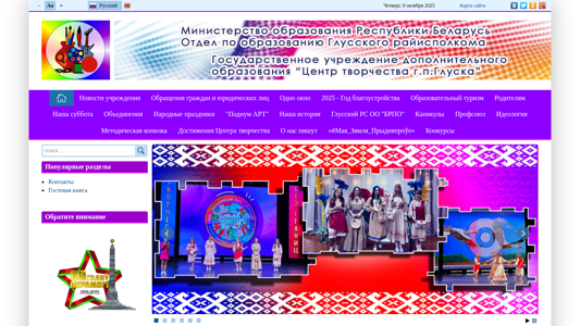 | AI-анализ | The portal ct.glusk.edu.by is a government educational institution named "Центр творчества г.п. Глуска." It is located in the town of Глуск, Могилёвская область. The website offers various educational and entertainment activities for different age groups, including master classes, games, and photo zones. It also features news sections about the institution, the region, and the republic. The website was created to provide additional education and has sections for registration, contacts, and statistics. The domain includes information about the history of the center and its achievements. The website was last updated on September 8, 2025, and includes sections for "День без автомобиля," "День народного единства," and "Республиканская неделя дополнительного образования." The website's top keywords include "творчества |