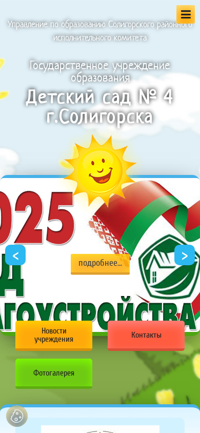 | AI-анализ | The portal sad4.edus.by is a website for Soligorsk Kindergarten No. 4. The title of the website is 'Детский сад № 4 г. Солигорска' and it contains information about the kindergarten, its administration, admission procedures, news, photo gallery, and various educational and safety-related activities. Keywords associated with the website include 'сад' (garden or kindergarten), 'учреждения' (institutions), 'новости' (news), 'Солигорска' (Soligorsk), and 'подробнее' (more). The website also features an interactive map, a history section, and information about various educational services and support for parents. The kindergarten is part of the 'ГУДО "Центр технического творчества детей и молод |