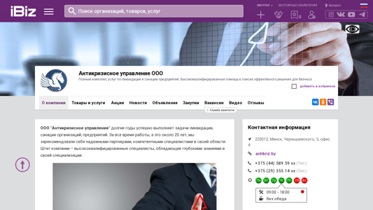 | AI-анализ | The website is for the Belarusian company "Anticrisis Management OOO," which offers a full range of services for the liquidation and sanitation of businesses. Highly qualified assistance is provided to help businesses find effective solutions. The company is located at 220012, Chernyшеvskogo 5, office 4, in Minisk, Belarus. Services include the liquidation of businesses, sanitation of businesses, comprehensive legal services, and more. The main goal is to resolve the client's problems, restore solvency, and return normal business operations. Legal rights and client interests are defended within the bounds of the law, and issues with creditors are addressed, as well as difficulties with accounting and taxation. In the event of an inability to maintain normal business operations, the company will liquidate the business to minimize losses and allow for the eventual restoration of the |