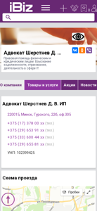 | AI-анализ | The website is a legal services provider based in Minsk, Belarus, with the address listed as Gurskogo 22b, office 305. The firm, Advokat Sherstnev D.V., offers assistance to both physical and legal entities in matters of debt recovery, insurance, and IT-related activities. The website provides contact information, including multiple phone numbers, and a map showing how to reach the office. The company's Unified State Register number is 102399425. The office is open from 9:00 AM to 6:00 PM, Monday through Friday, with no lunch break. Services are offered in the categories of legal services and legal services in Minsk. |