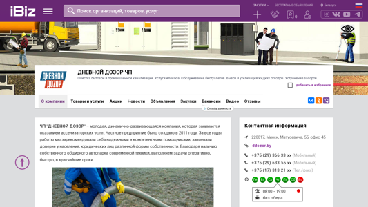 | AI-анализ | --- This website is for a Belarusian company named "ЧП 'ДНЕВНОЙ ДОЗОР'" (JSC "Day Watch") based in Minsk. The company specializes in the cleaning and maintenance of both residential and industrial sewage systems, providing services related to sewage sludge, septic tank maintenance, wastewater removal and treatment, and drain unclogging. The website includes contact information and a location address at Матусевича, 55, офис 45, 220017, Minsk. The company's main services include sewage pumping and disposal, septic tank cleaning, and wastewater treatment. The website is dominated by keywords related to these services, such as "услуги" (services), "канализации" (sewage), "откачка" (pump |