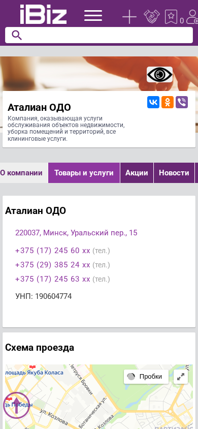 | AI-анализ | The portal atalian.ibiz.by is a company website providing services for the maintenance and cleaning of real estate, including room and territory cleaning, all cleaning services. The company is located in Minsk, Belarus, at Uralsky per. 15. Contact information includes phone numbers +375 (17) 245 60 xx, +375 (29) 385 24 xx, and +375 (17) 245 63 xx. The company's UNP number is 190604774. Office hours are Monday through Friday from 8:30 AM to 5:30 PM, with no lunch break. The website offers professional cleaning services and is listed under the 'Professional Cleaning' category in the business directory, as well as under |