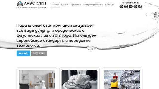 | AI-анализ | This online resource is a cleaning company website based in Minsk, Belarus, with the title "Арэс Клин - Клининговая компания в Минске" (Ares Clean - Cleaning Company in Minsk). The description includes phrases such as "клининг" (cleaning), "прачечная" (laundry), "аренда" (rent), "оборудования" (equipment), and "минске" (Minsk). The website offers various services for both legal and individual clients since 2012, using European standards and advanced technologies. The menu includes options for "Клининг" (Cleaning), "Прачечная" (Laundry), and "Аренда оборудования" (Equipment Rental). The contact information provided includes two phone numbers: |