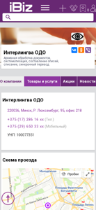 AI-анализ | The website is for Interlingva ODO, a document processing and archiving company located in Minsk, Belarus. Services offered include document systematization, description composition, disposal, and synchronous translation. The contact information and address are provided, along with a map for directions. Keywords related to translation and document services are prominent. The website offers various categories such as 'Company', 'Services', 'News', and 'Contacts', and features sections for 'Vacancies', 'Testimonials', and 'Videos'. The company's UNP number is listed. The website operates Monday through Friday from 9:00 AM to 6:00 PM without lunch breaks. |