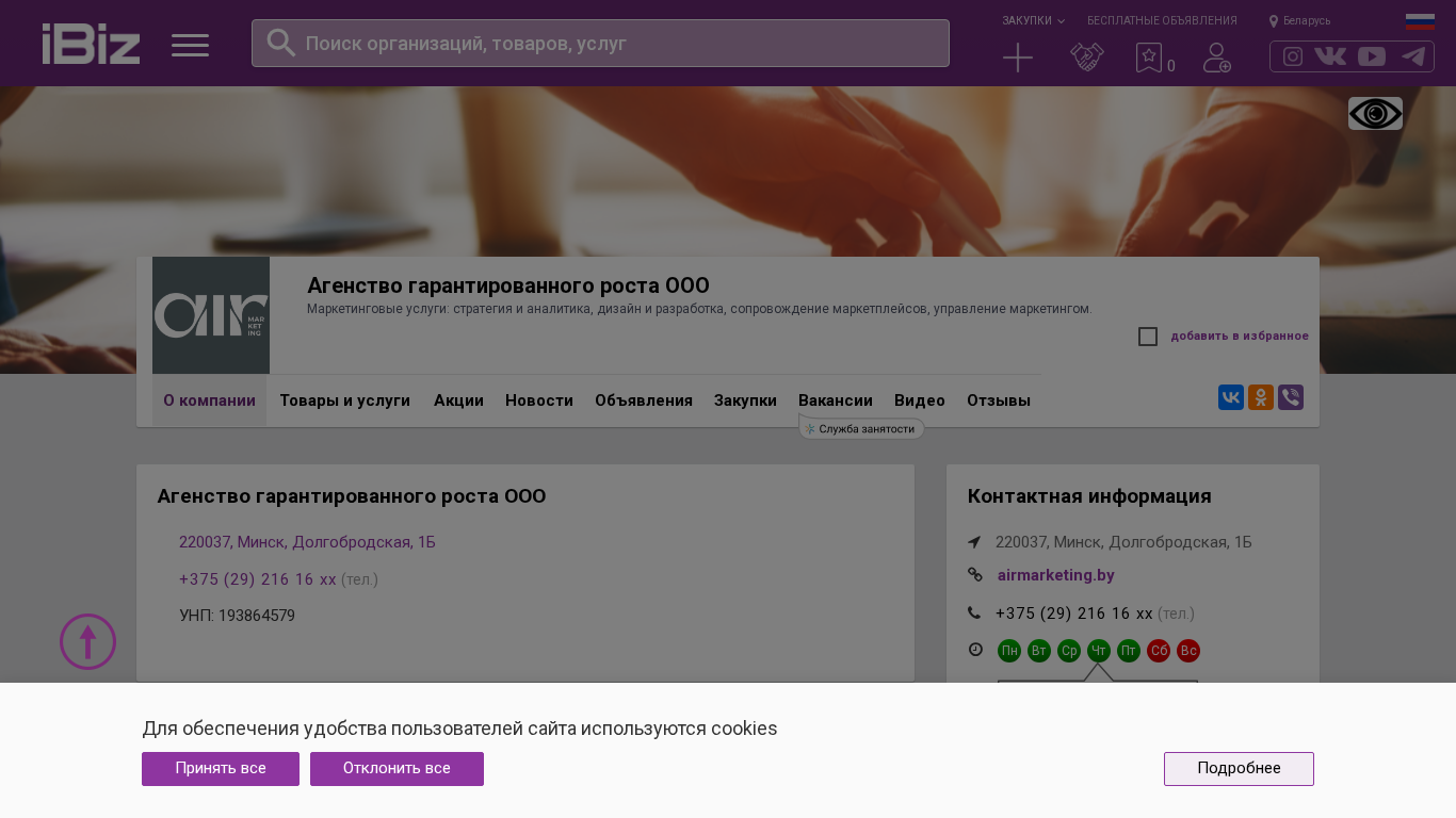 | Название / Заголовок | Агенство гарантированного роста ООО - Маркетинговые услуги: стратегия и аналитика, дизайн и разработка, сопровождение маркетплейсов, управление маркетингом.. 220037, Минск, , Долгобродская, 1Б |