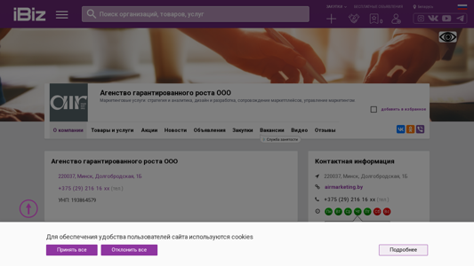 | AI-анализ | The portal is a marketing agency named "Агенство гарантированного роста ООО" located in Minsk, Belarus, at Dolgobrodskaya 1B. The agency offers marketing services including strategy and analysis, design and development, marketplace management, and marketing management. The contact information, including phone number and address, is provided. The website includes sections for company information, products and services, consulting services, and news. The company can be found in the categories of consulting services and business services in Minsk. |