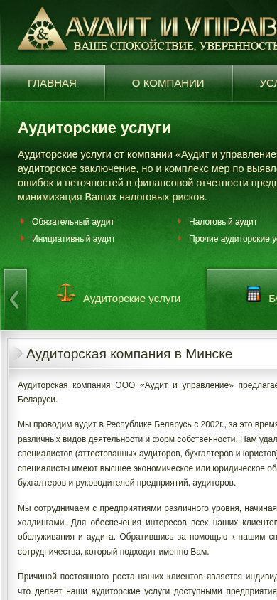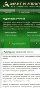 | SEO-описание | Лучшая аудиторская компания в Минске является «Аудит и управление». Мы проводим аудит в Республике Беларусь с 2002 г. За 10-ти летний опыт компания зарекомендовала себя как надежная и ответственная аудиторская компания в Минске. |
