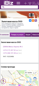 | AI-анализ | This website is a branch of a gold and silver pawnshop chain, "Залоговая касса ООО - Сеть ломбардов," located in Minsk, Belarus. The website provides information about the company's services and products, including electronics, smartphones, tablets, tools, vacation and tourism items, and precious metals. The address and contact numbers are listed, along with a map and opening hours, which are from 9:00 AM to 9:00 PM without lunch breaks from Monday to Sunday. The website also has sections for company news, vacancies, and customer feedback on social media platforms. The domain name is "zalog-kassa.ibiz.by." |