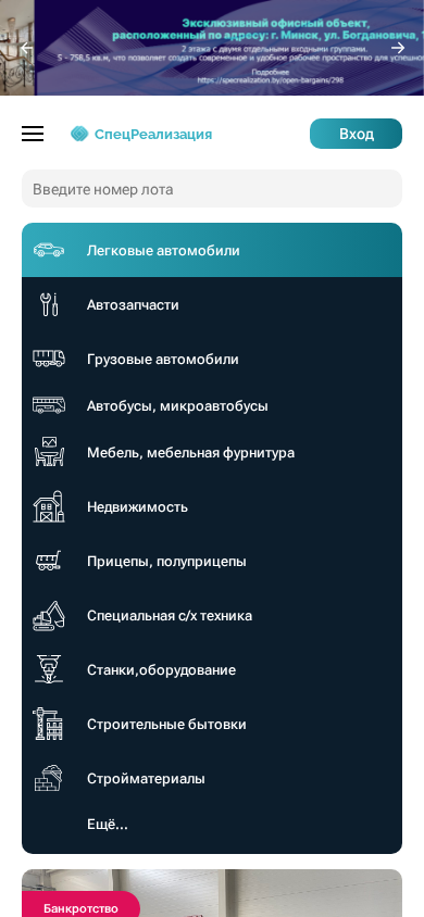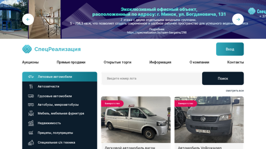 | AI-анализ | The portal Specrealization is a marketplace for direct sales and open auctions of various types of goods. The offerings include light vehicles, such as passenger cars and vans, as well as heavy vehicles like trucks and buses, construction equipment, and miscellaneous items such as furniture, real estate, and farm machinery. The website provides information on ongoing and upcoming sales, including dates, minimum bids, and starting prices for individual items. Examples of items currently up for sale include a Volkswagen Caravelle wagon from 2013, a Volkswagen Transporter van from 2007, and a BMW X6 SUV from 2012. The portal also offers information on bankruptcy sales, with details on the vehicle model, color, VIN number, and type of sale. The website does not provide any contact information or links. |
